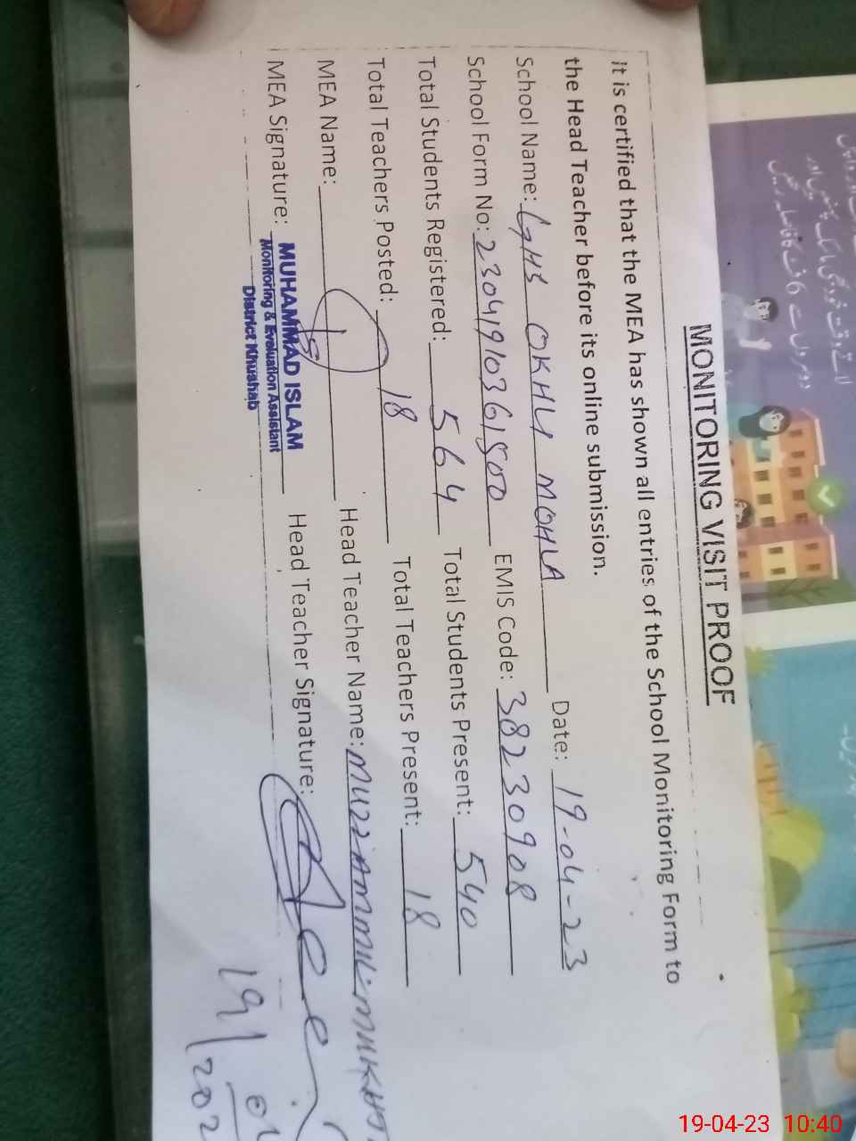 | EMIS Code: 38230908 | Name of School: GHS OKHLI MOHLA | |||