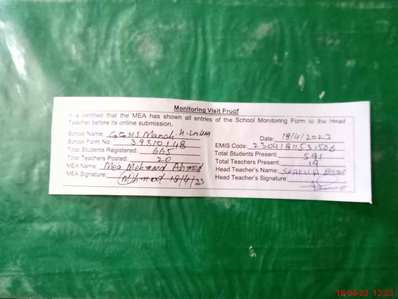| Attendance Register | Head Teacher | MEA with School | Visit Proof |