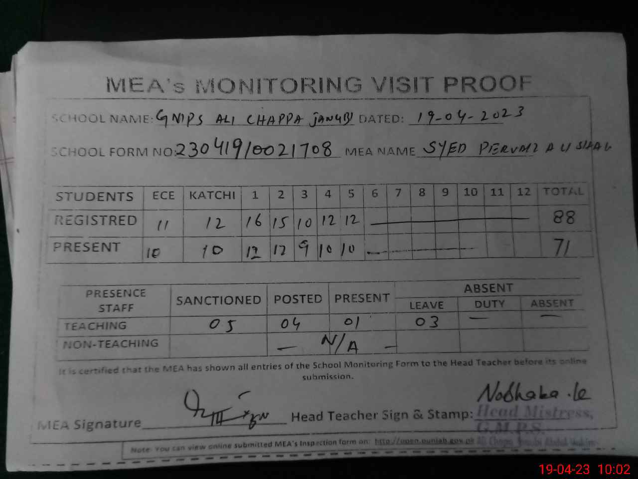 | Attendance Register | Head Teacher | MEA with School | Visit Proof |