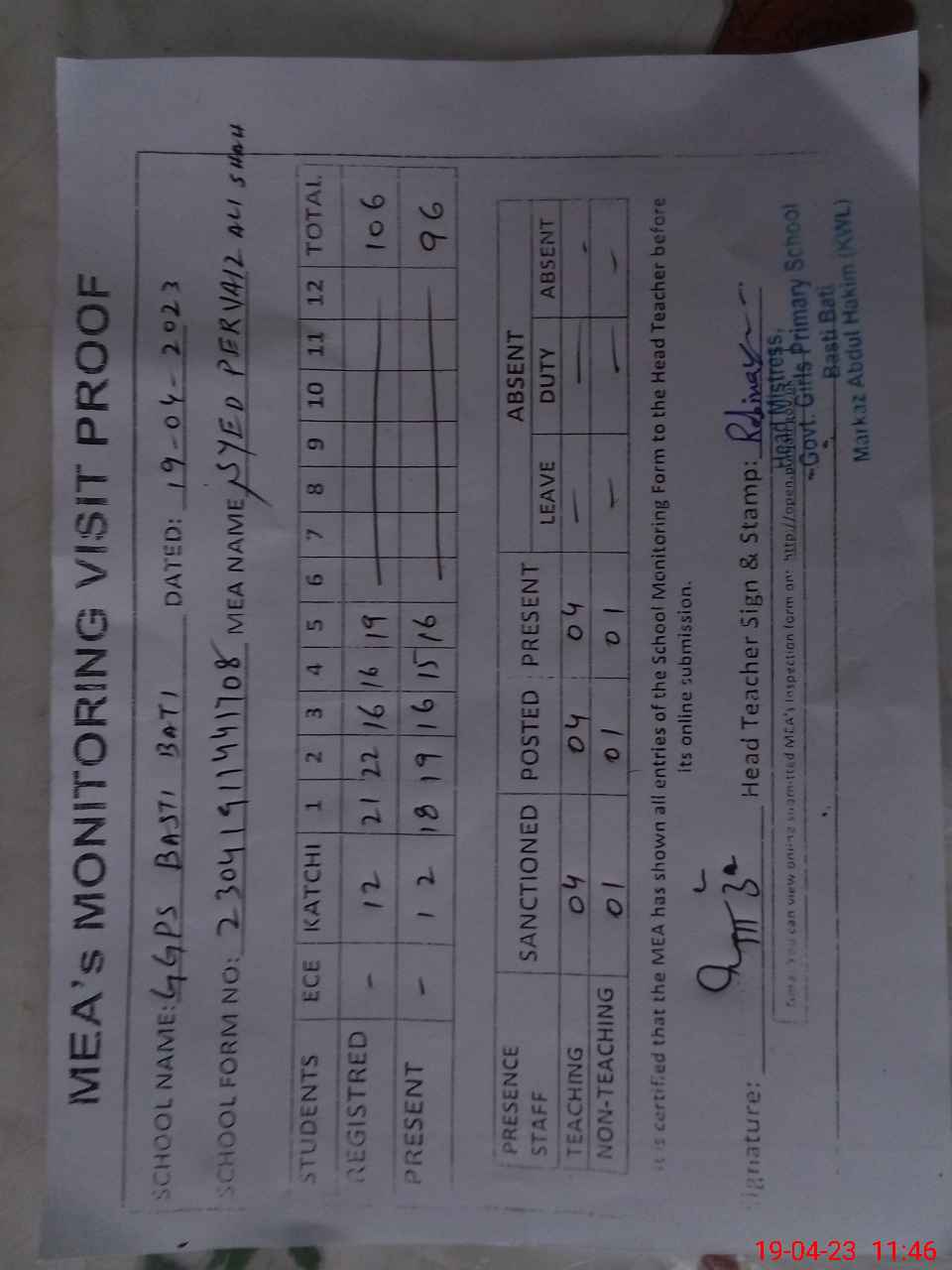 | Attendance Register | Head Teacher | MEA with School | Visit Proof |