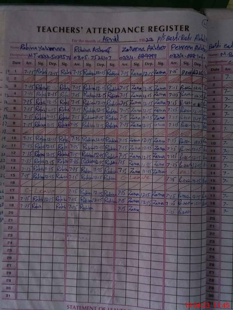 | CNIC | Full Name | Designation | R/C | Absence During Last Calender Month |
