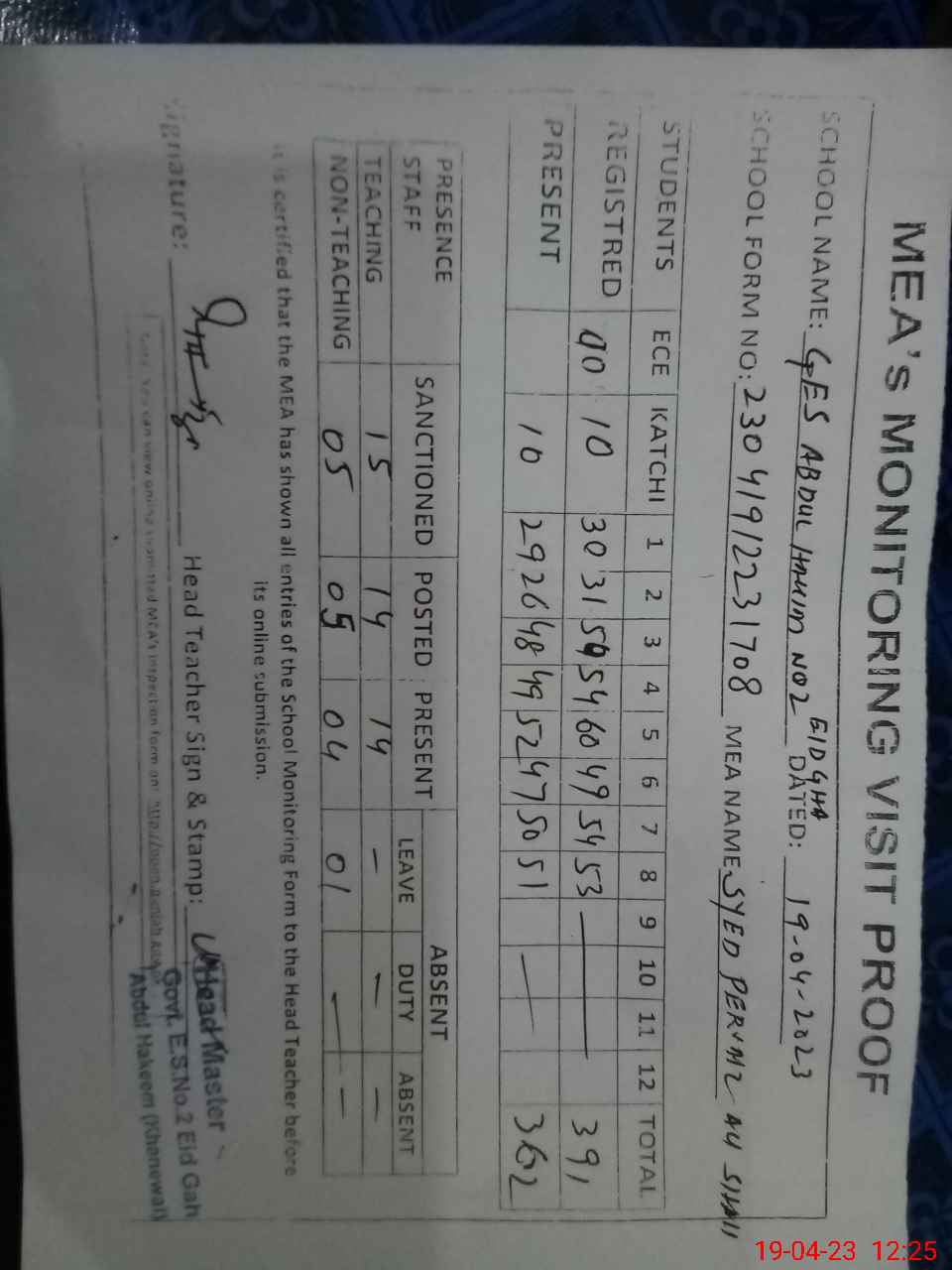 | Attendance Register | Head Teacher | MEA with School | Visit Proof |