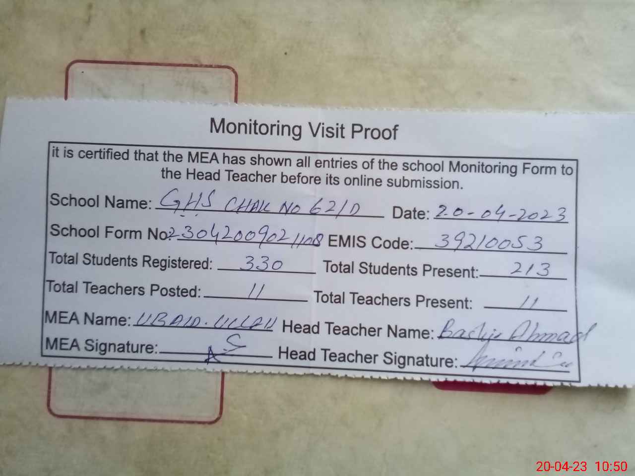 | EMIS Code: 39210053 | Name of School: GHS CHAK NO. 62/D | |||