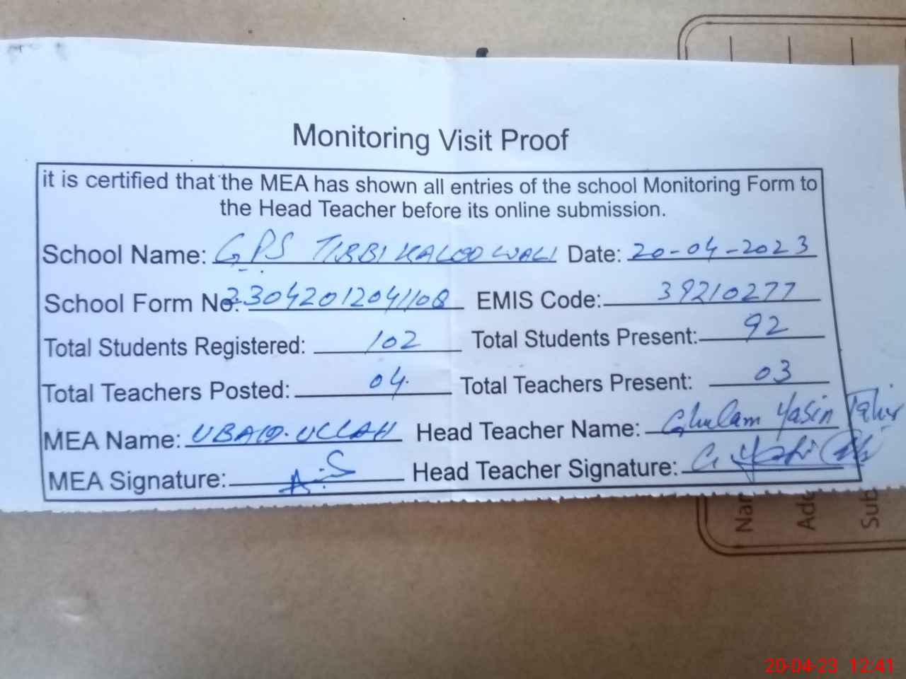 | Attendance Register | Head Teacher | MEA with School | Visit Proof |