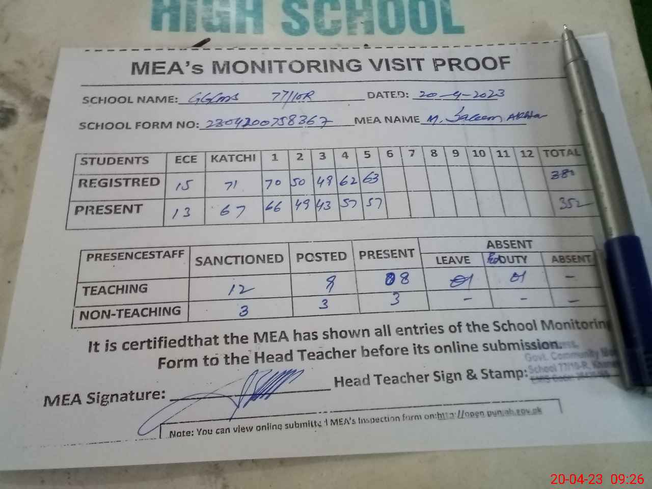 | Attendance Register | Head Teacher | MEA with School | Visit Proof |