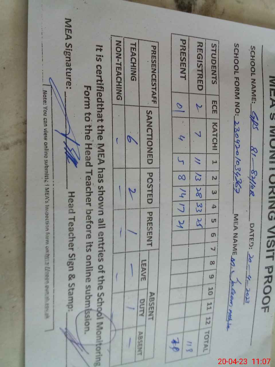 | Attendance Register | Head Teacher | MEA with School | Visit Proof |