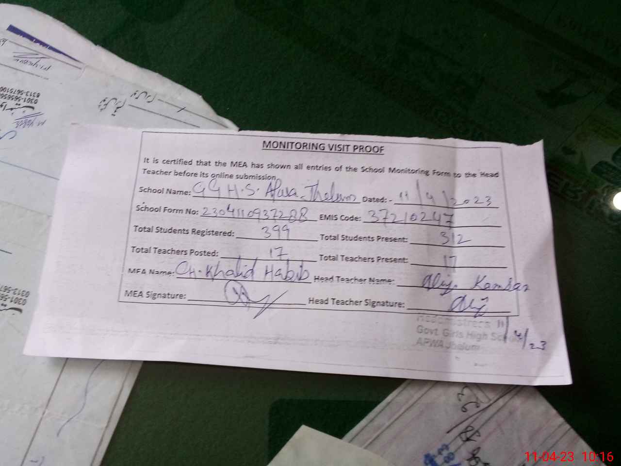 | Attendance Register | Head Teacher | MEA with School | Visit Proof |