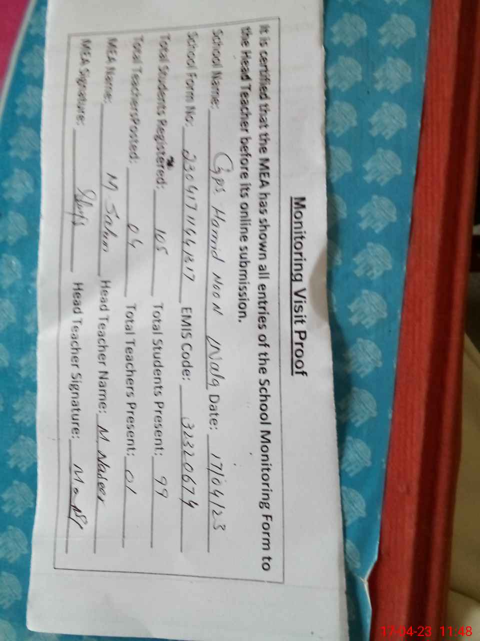 | EMIS Code: 32320674 | Name of School: GPS HAMID NOON WALA | |||