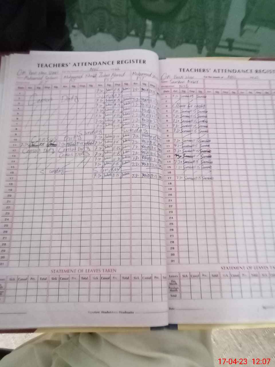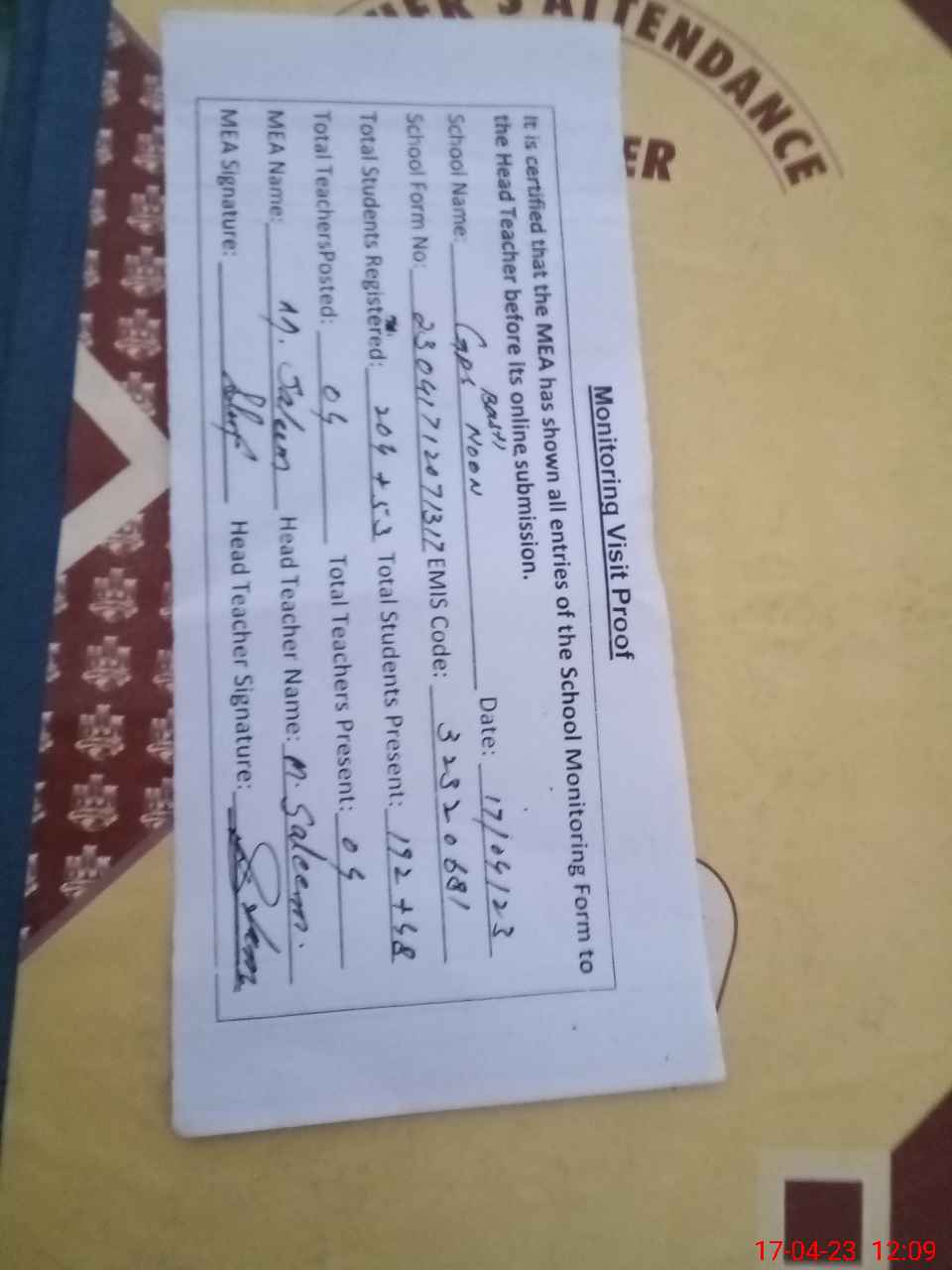 | Attendance Register | Head Teacher | MEA with School | Visit Proof |