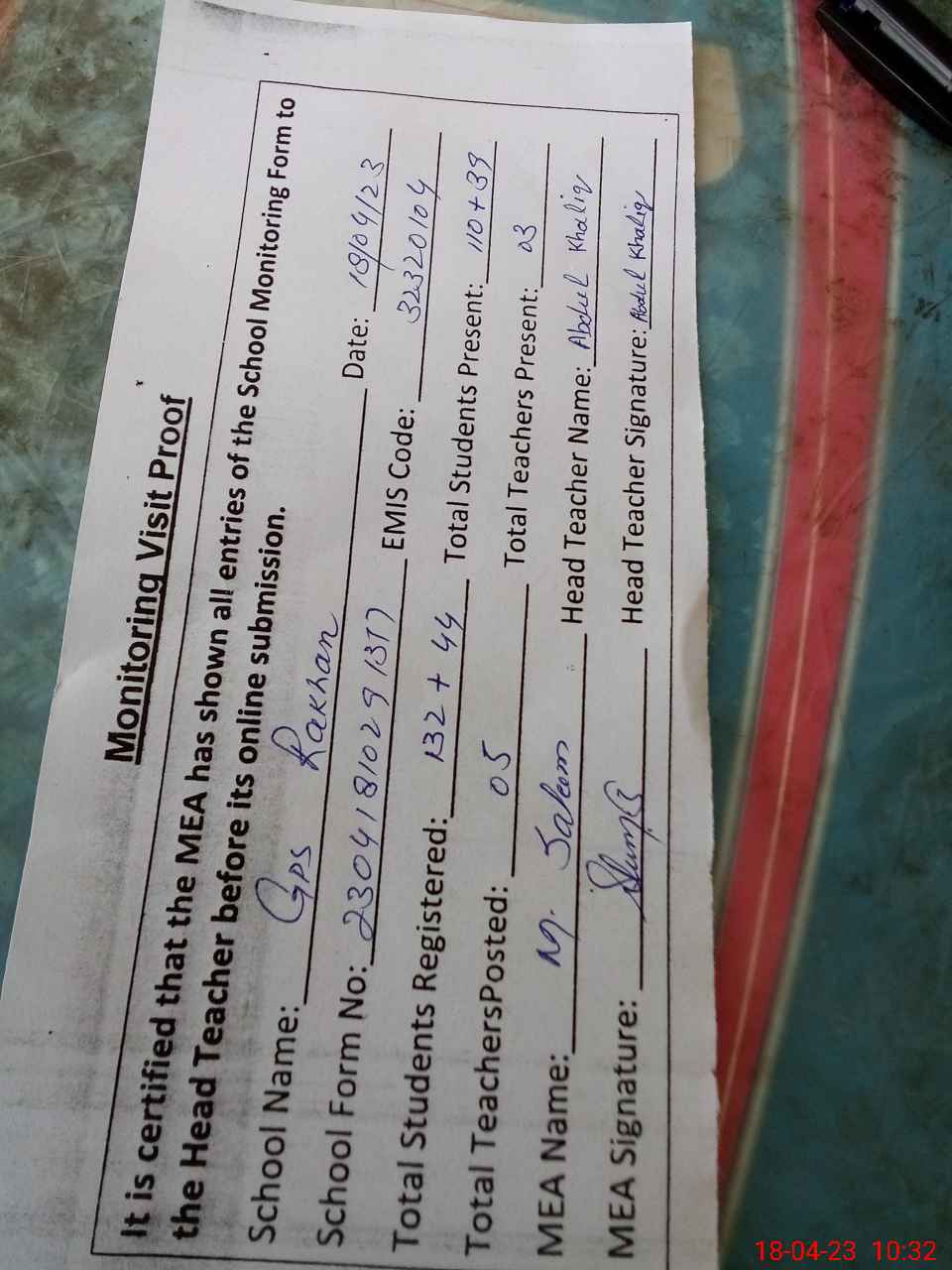 | Attendance Register | Head Teacher | MEA with School | Visit Proof |