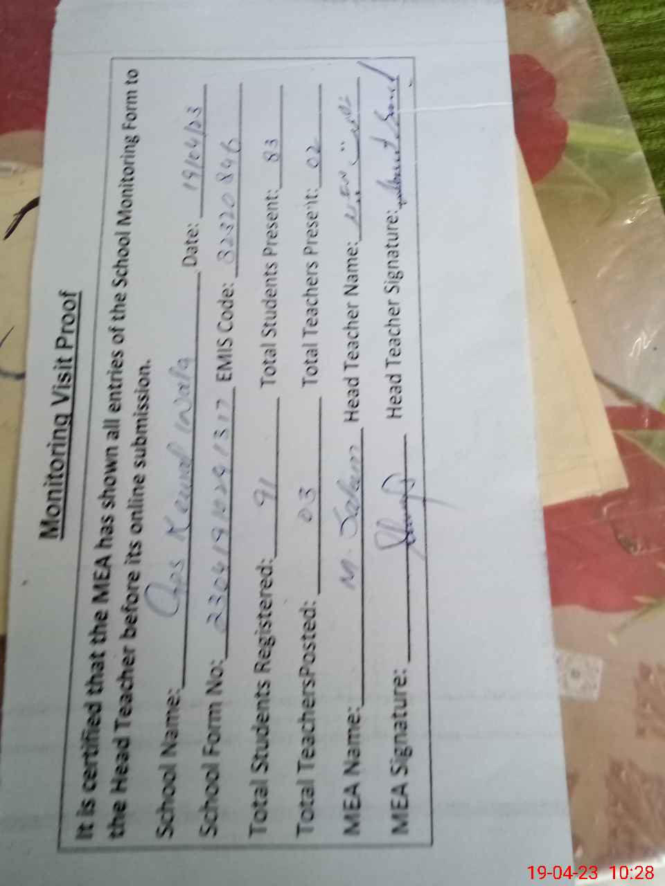 | Attendance Register | Head Teacher | MEA with School | Visit Proof |