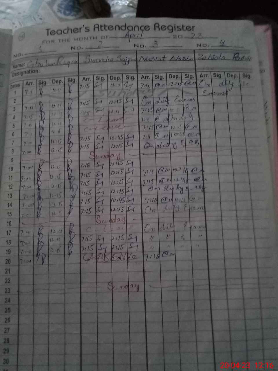 | 36**** | Za**** Pe**** | Regular | 2 | 0 | 0 | 0 | 0 | 0 | 0 | 0 | 2 | Exam Duty | |