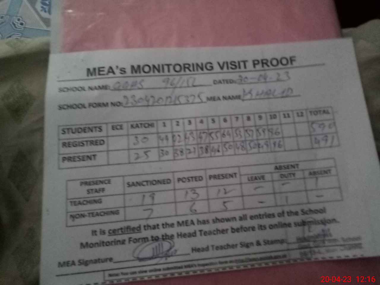 | Attendance Register | Head Teacher | MEA with School | Visit Proof |