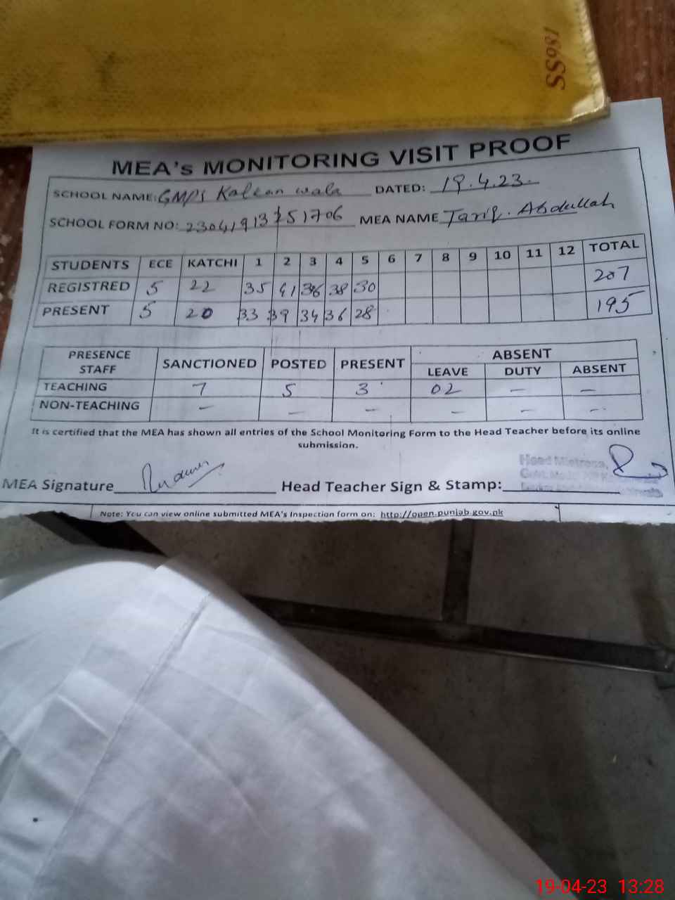 | Attendance Register | Head Teacher | MEA with School | Visit Proof |