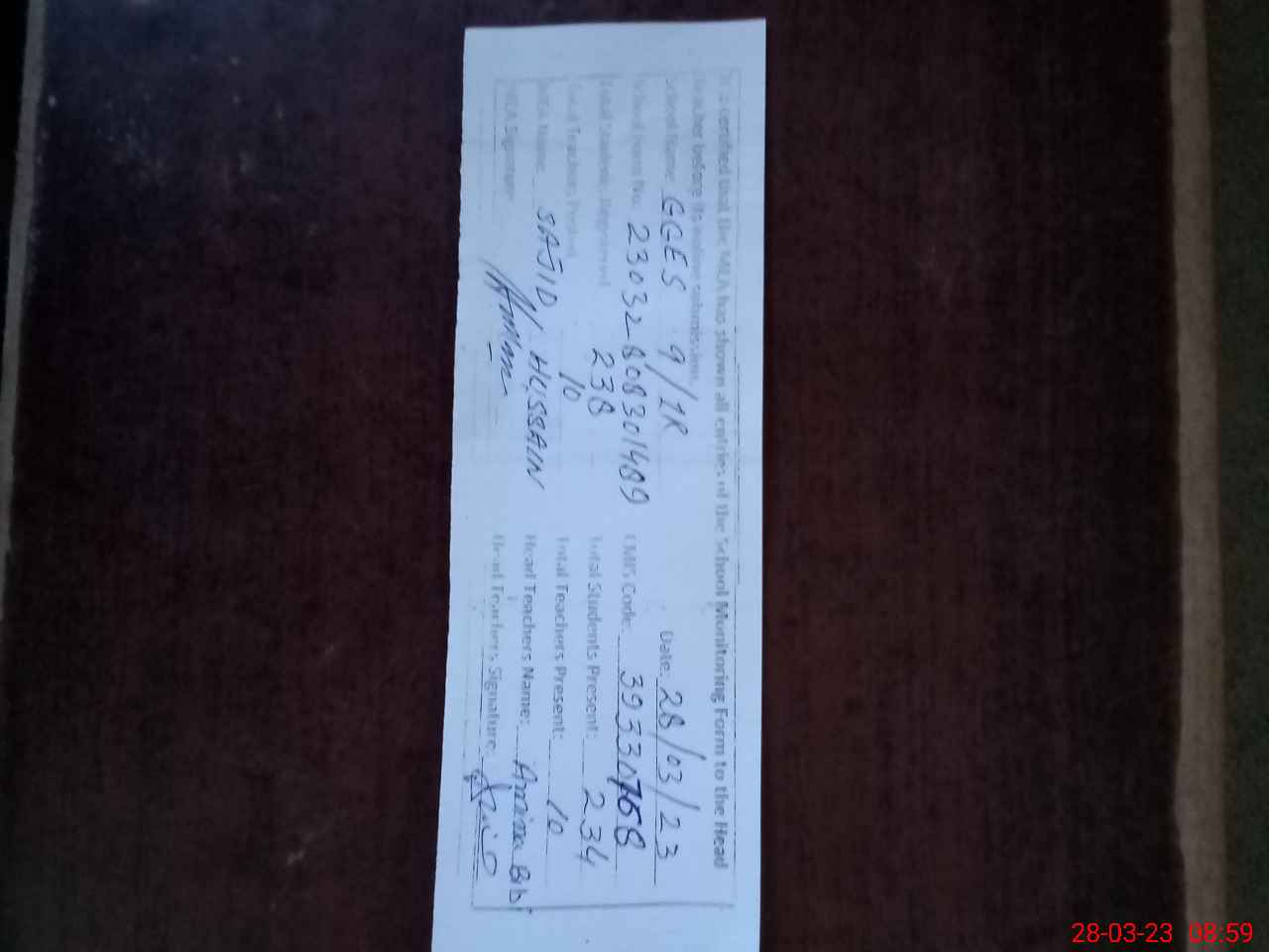 | Attendance Register | Head Teacher | MEA with School | Visit Proof |