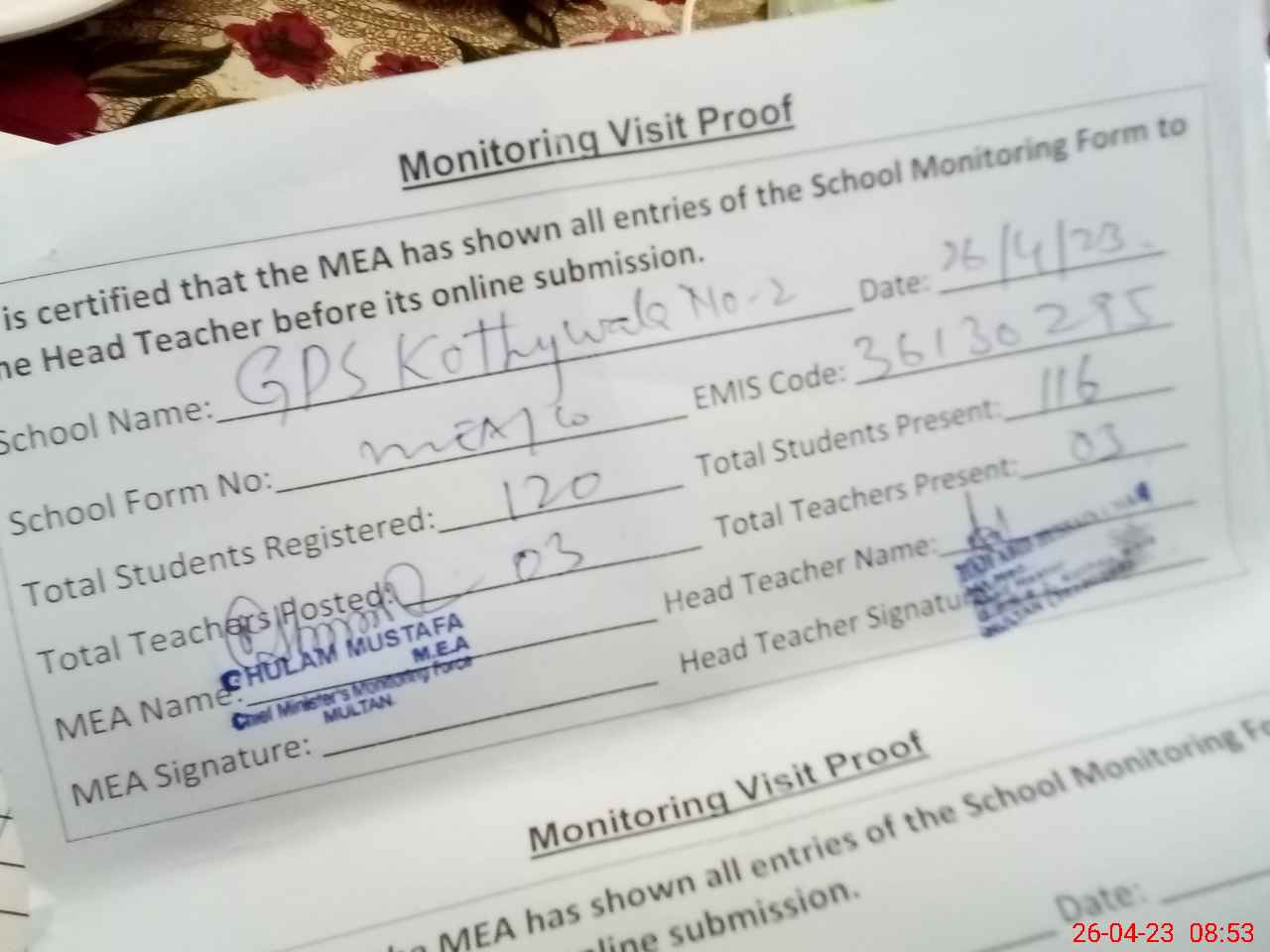 | EMIS Code: 36130295 | Name of School: GPS KOTHEY WALA NO. 2 MULTAN | |||