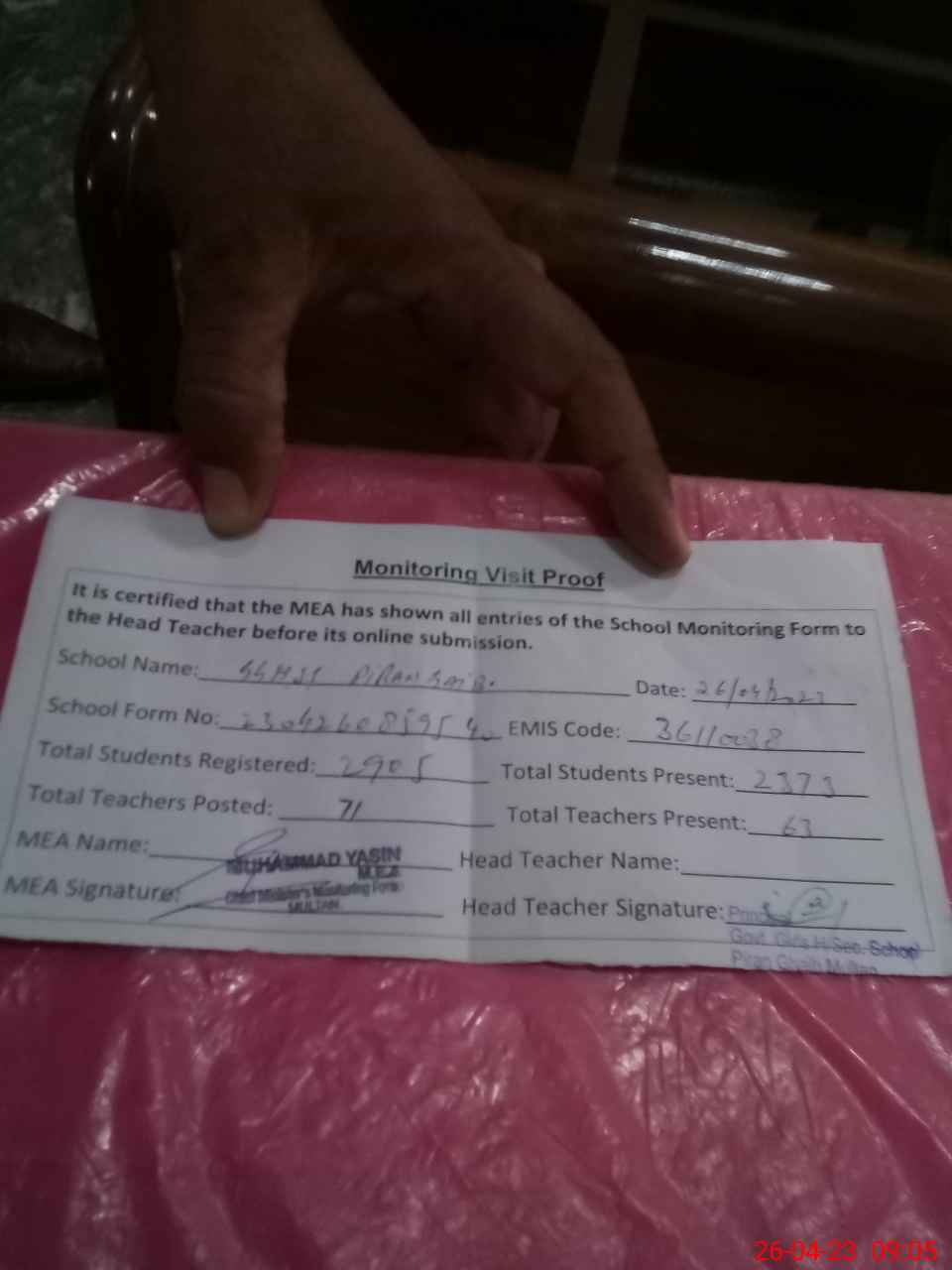 | Attendance Register | Head Teacher | MEA with School | Visit Proof |