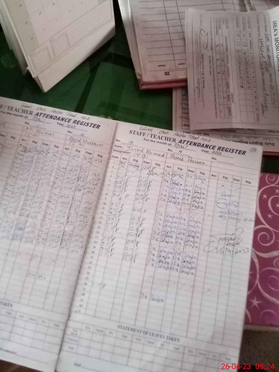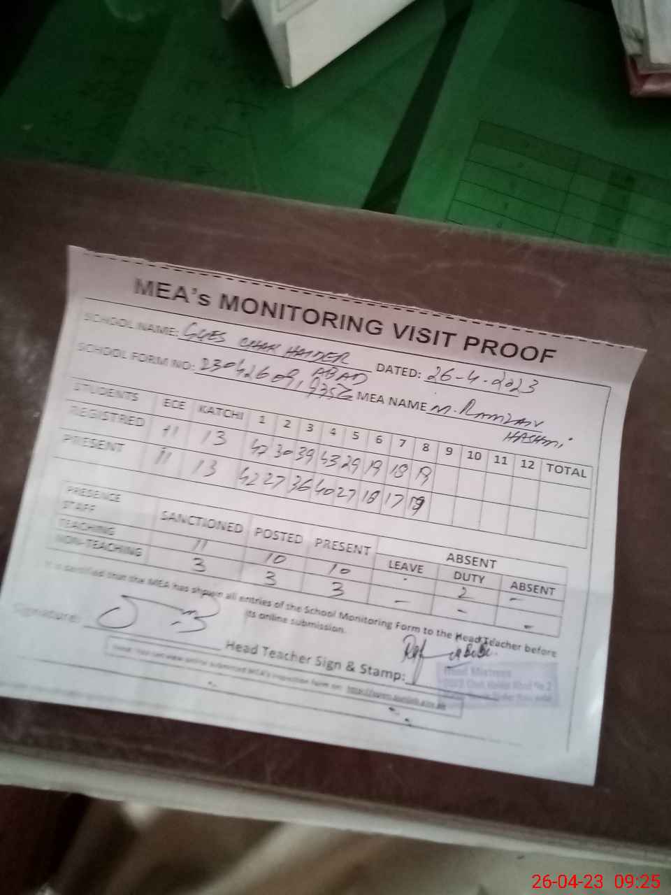 | Attendance Register | Head Teacher | MEA with School | Visit Proof |