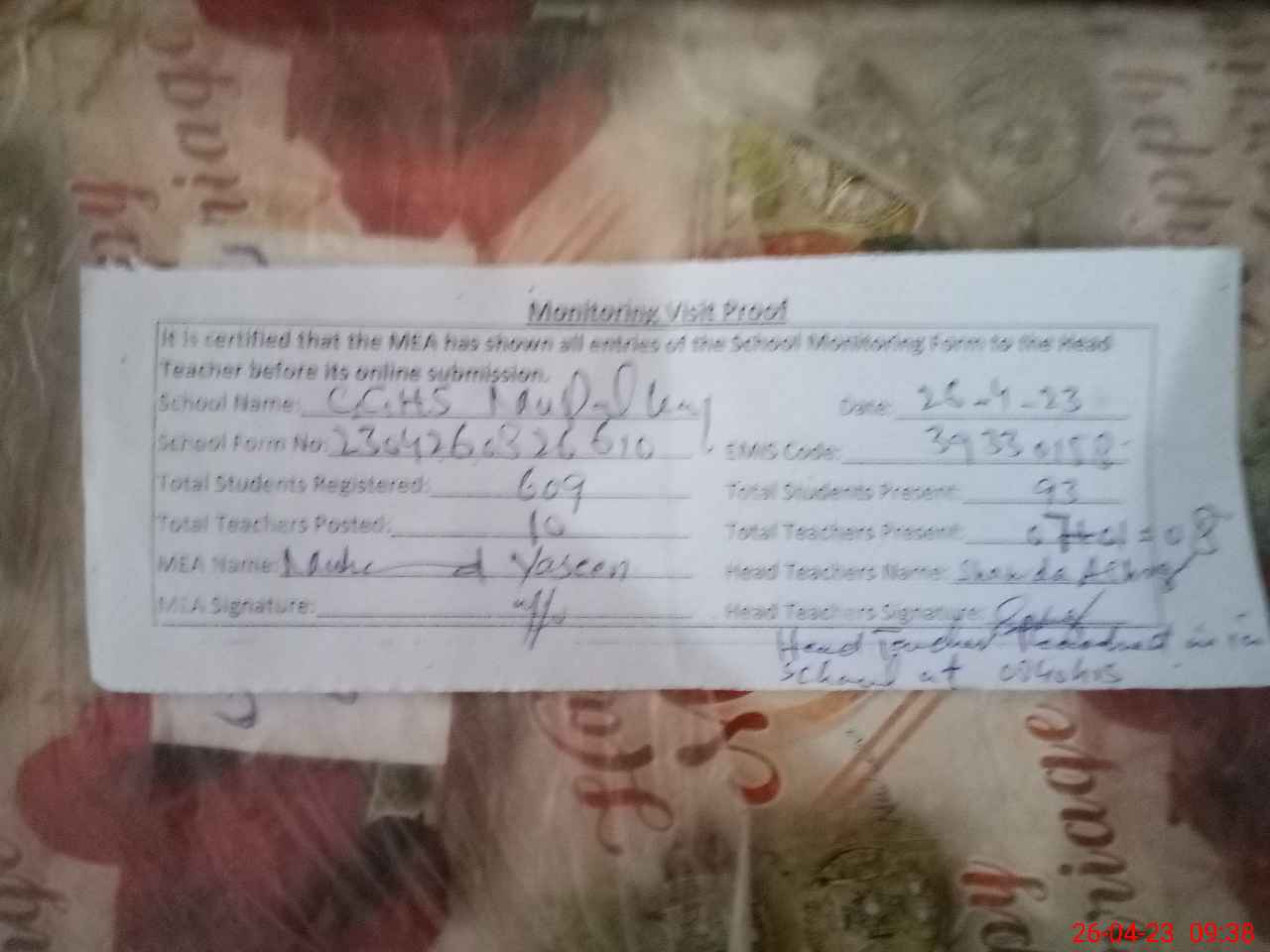 | Attendance Register | Head Teacher | MEA with School | Visit Proof |