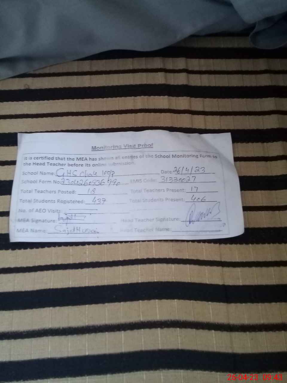 | Attendance Register | Head Teacher | MEA with School | Visit Proof |