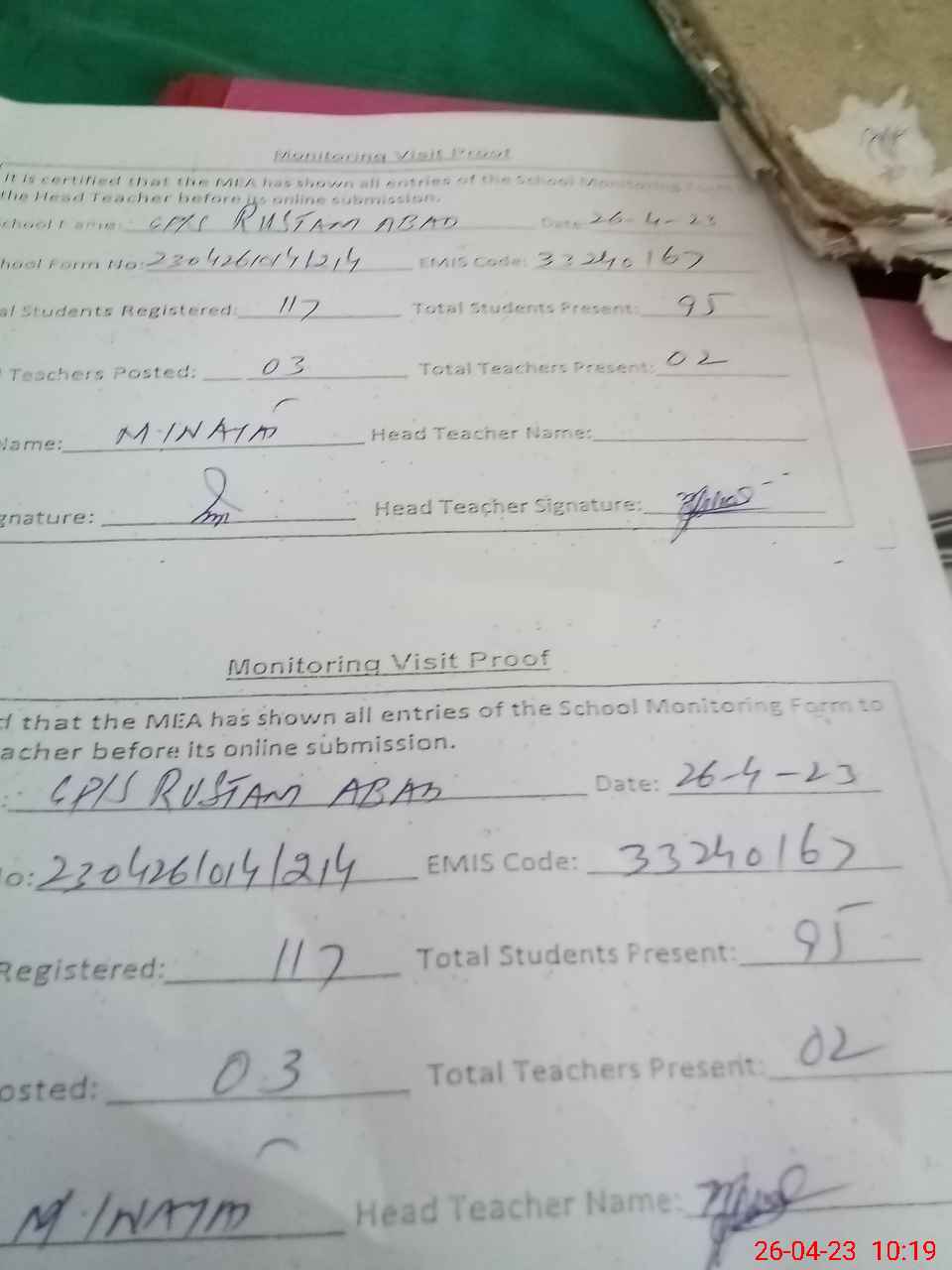 | Attendance Register | Head Teacher | MEA with School | Visit Proof |