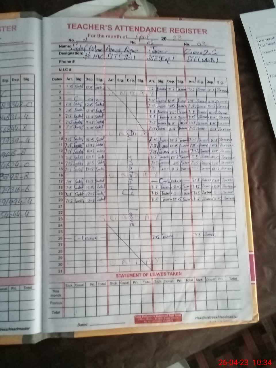 | CNIC | Full Name | Designation | R/C | Absence During Last Calender Month |