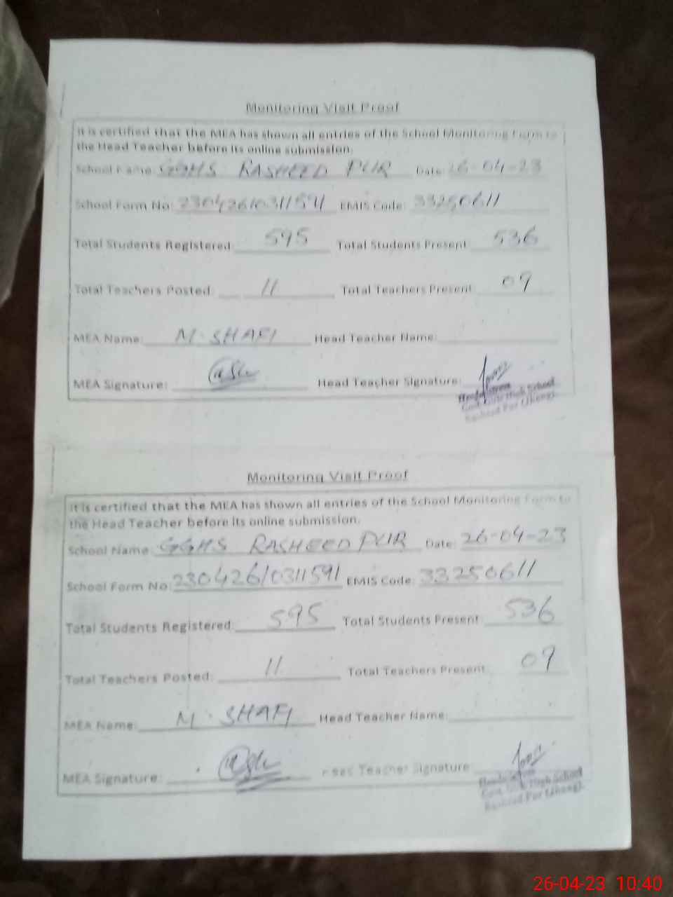 | Attendance Register | Head Teacher | MEA with School | Visit Proof |