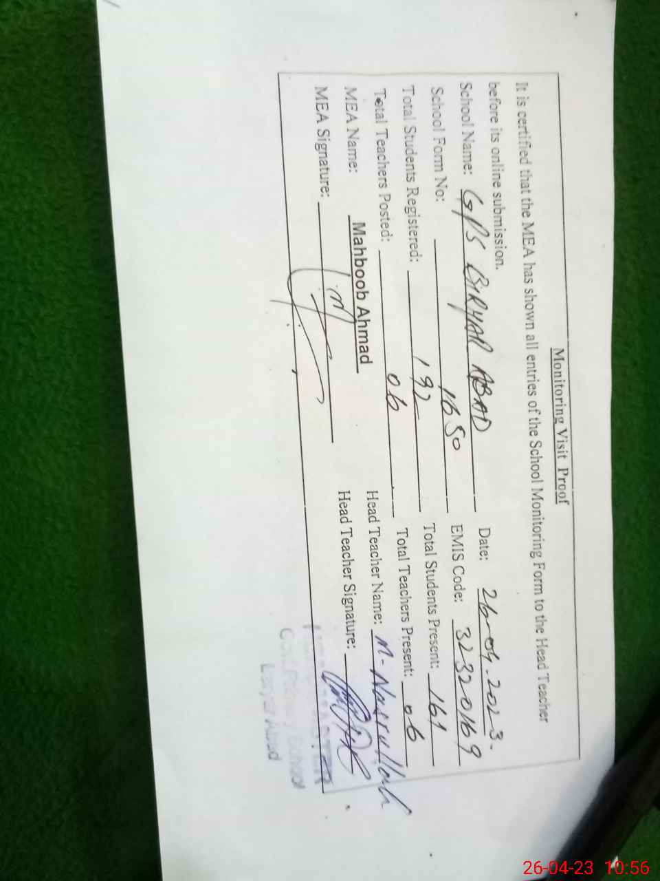 | Certified that this School was Inspected by the Undersigned MEA/DMO Today and the Information Stated Above is as Per Record. | |||||