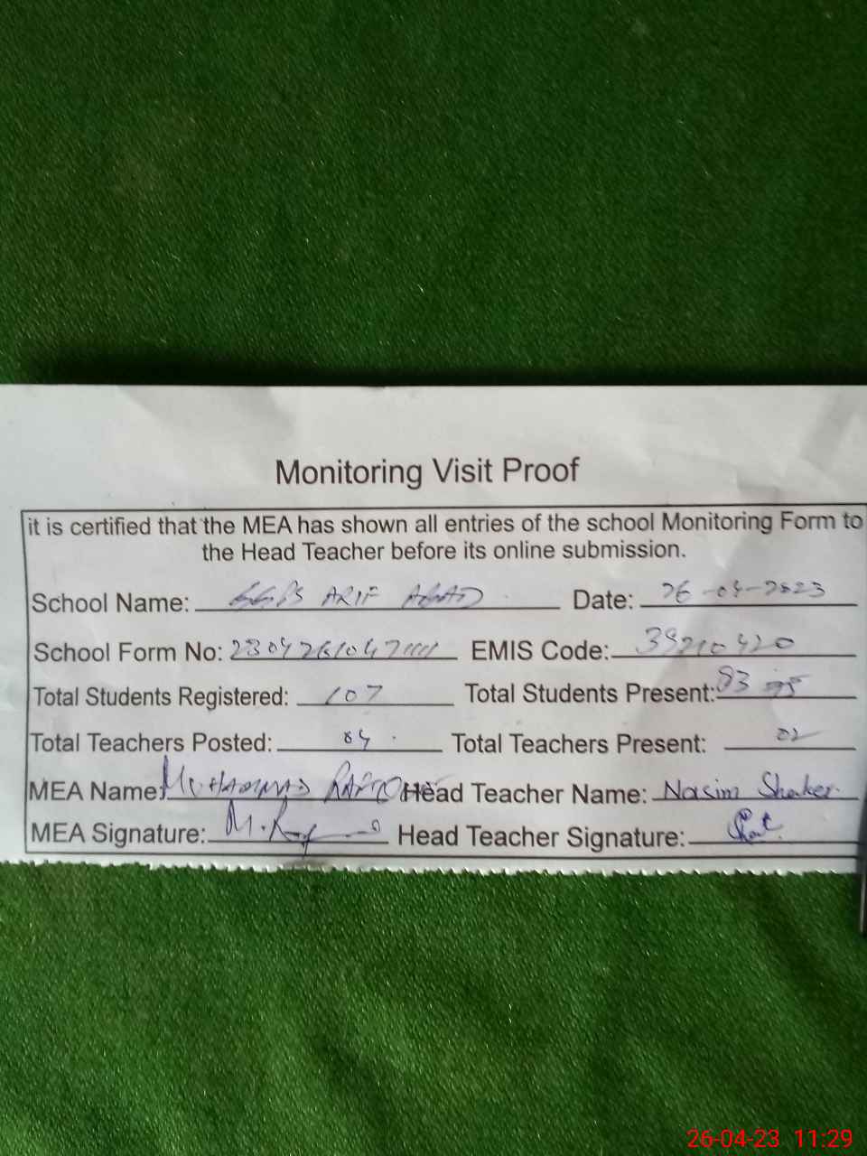 | Attendance Register | Head Teacher | MEA with School | Visit Proof |