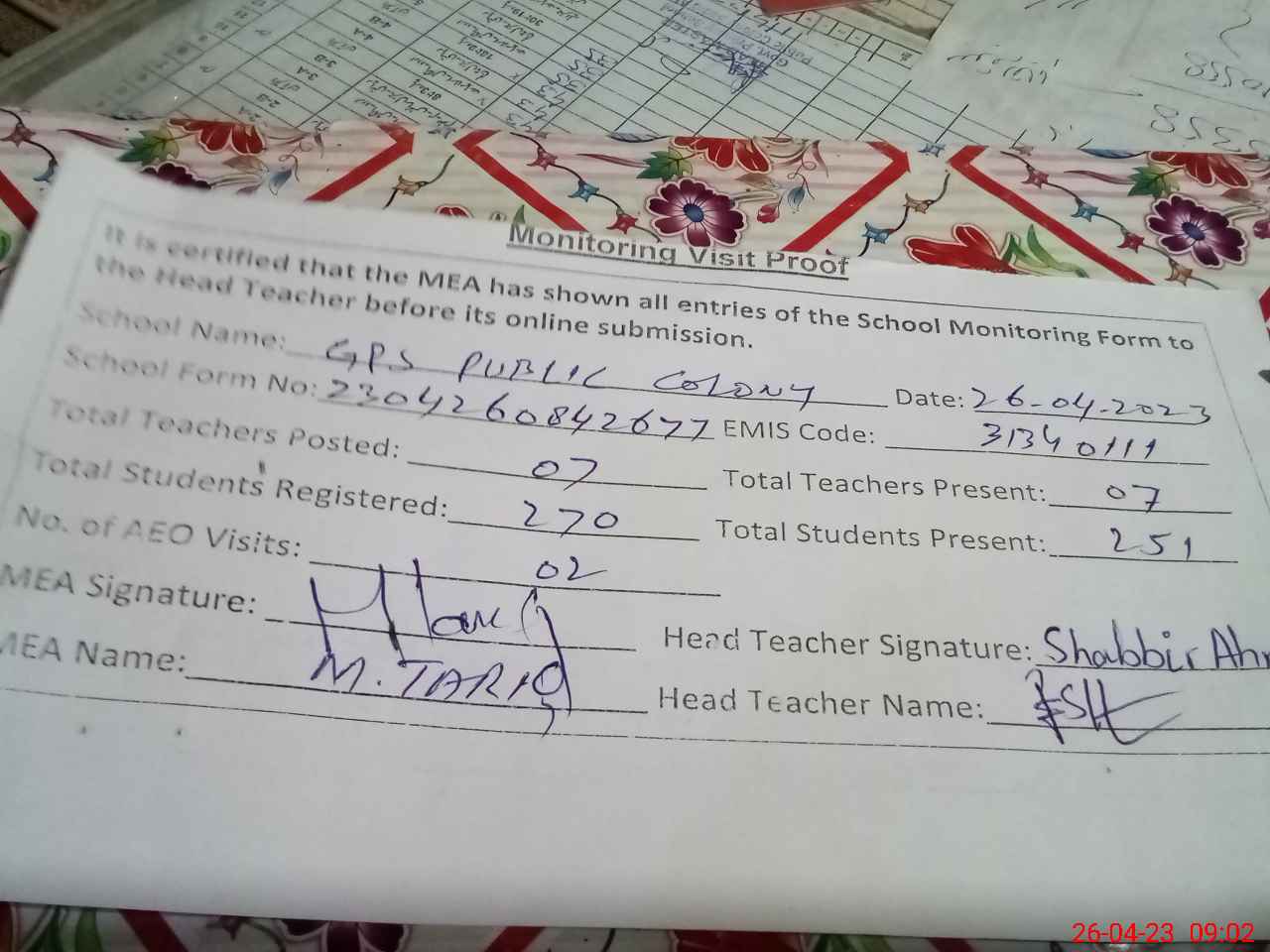 | Attendance Register | Head Teacher | MEA with School | Visit Proof |