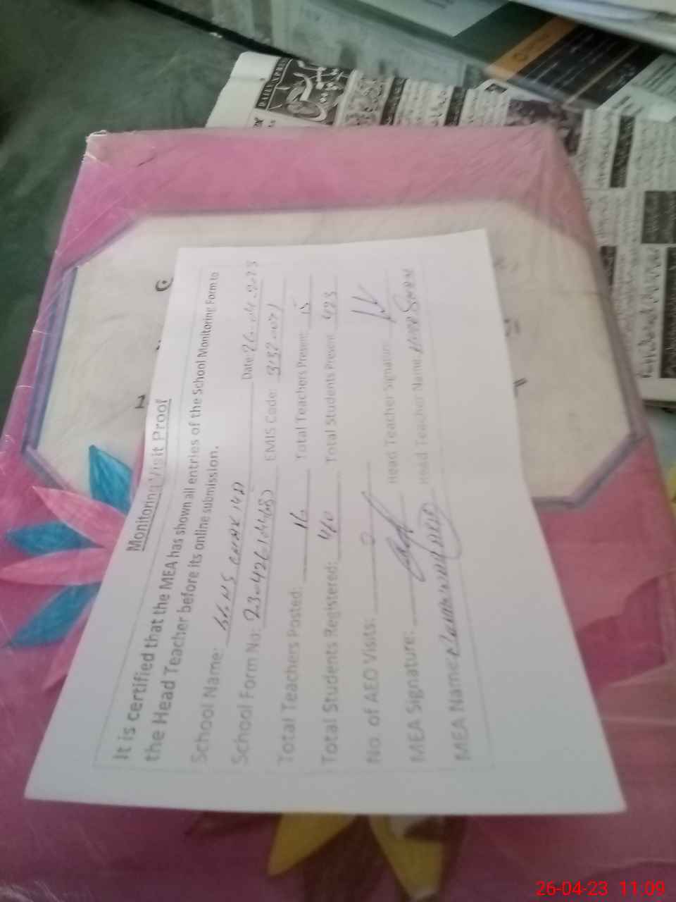 | Attendance Register | Head Teacher | MEA with School | Visit Proof |
