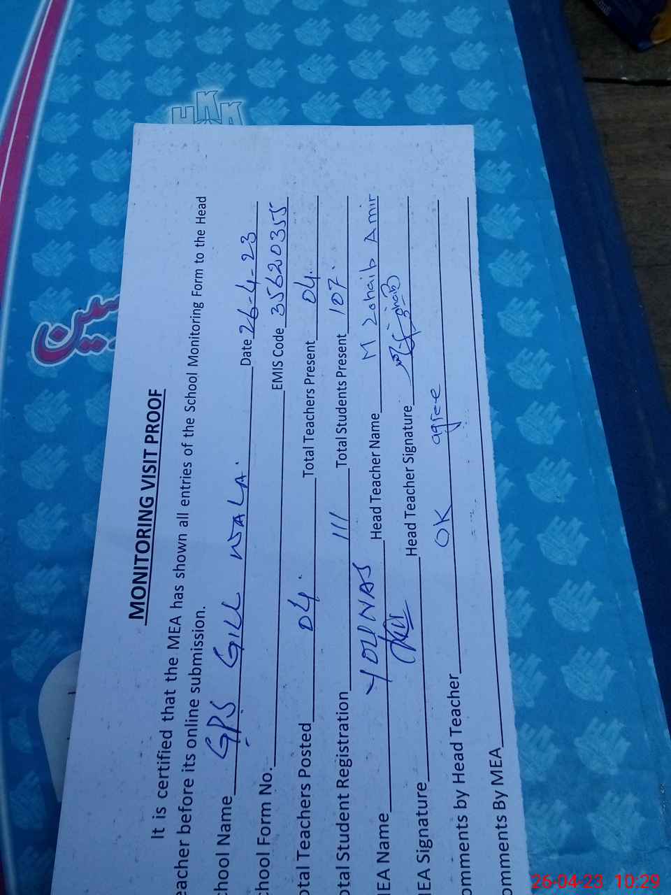 | Attendance Register | Head Teacher | MEA with School | Visit Proof |