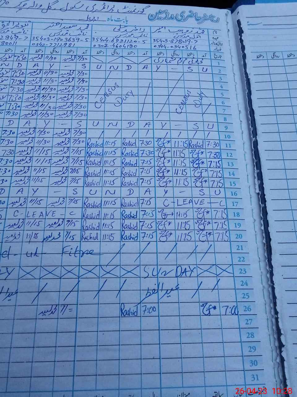 | CNIC | Full Name | Designation | R/C | Absence During Last Calender Month |