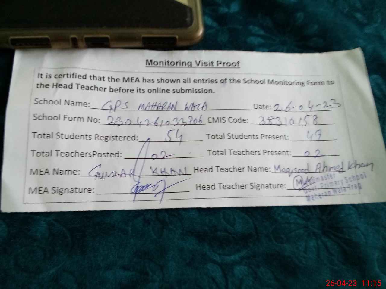 | EMIS Code: 38310158 | Name of School: GPS MAHARAN WALA TRAG | |||