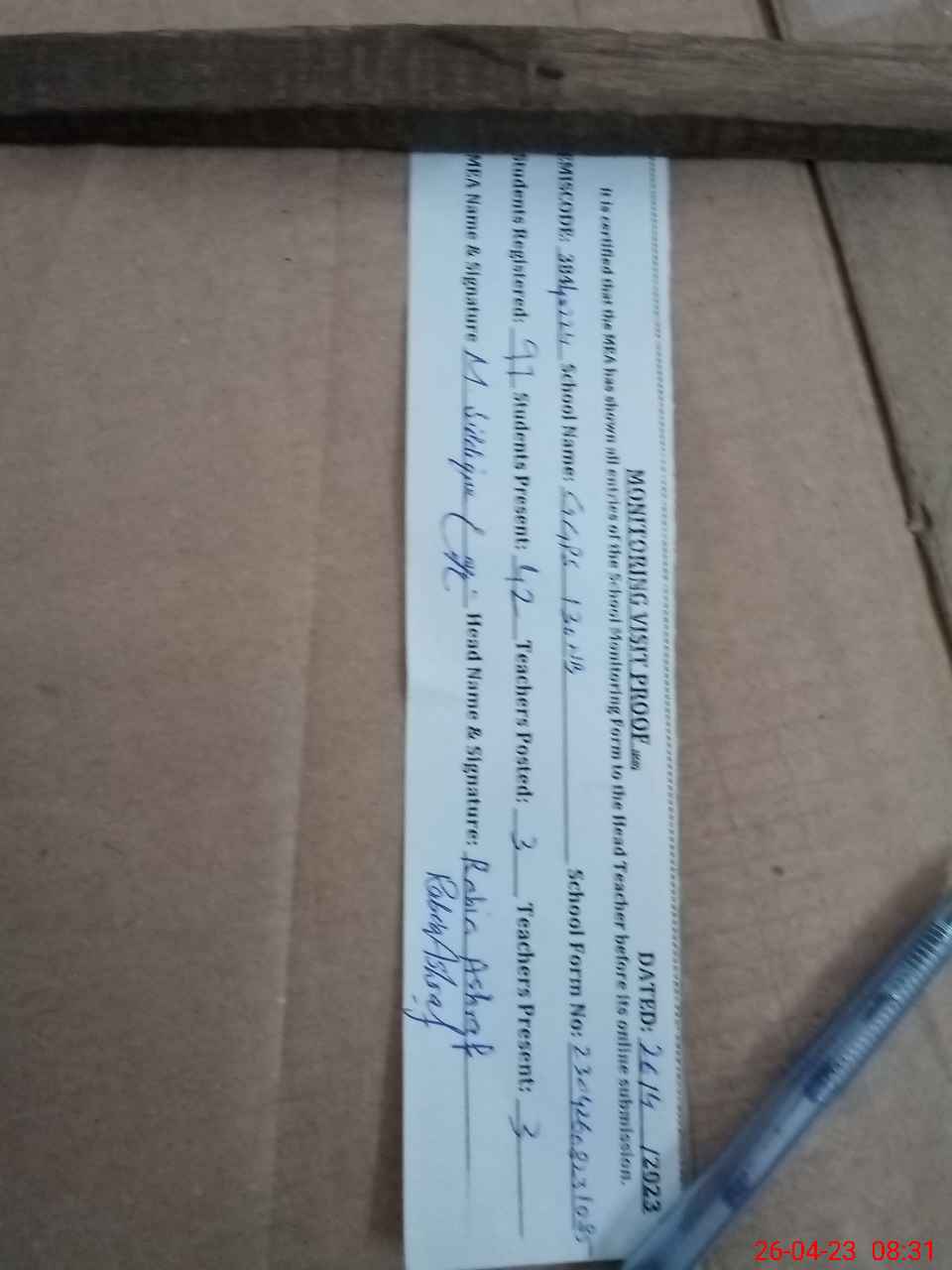 | Attendance Register | Head Teacher | MEA with School | Visit Proof |