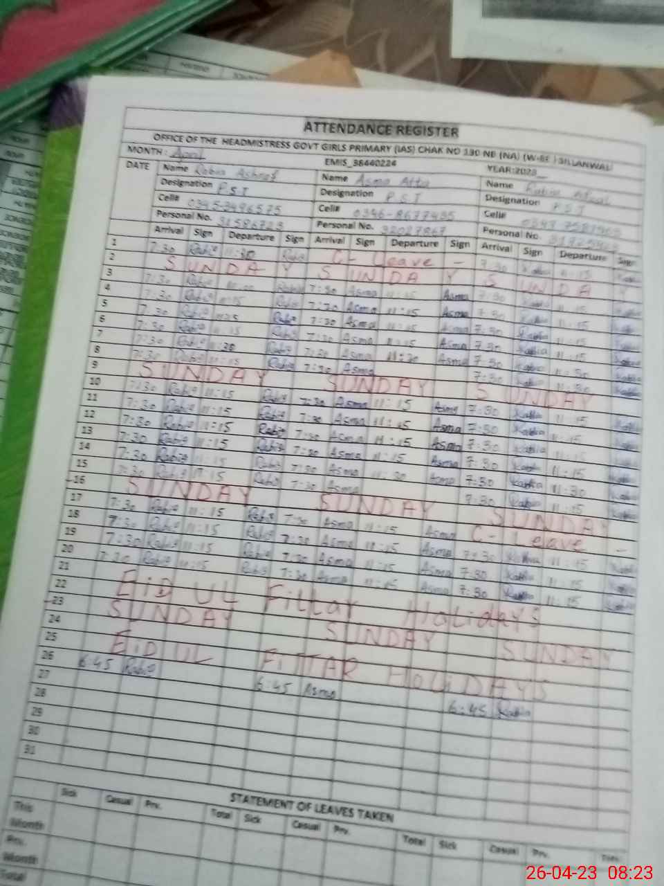 | Name: Re**** Ba**** Designation: (School Headmaster's/Headmistress's) PST Phone/Cell Number: 03**** |