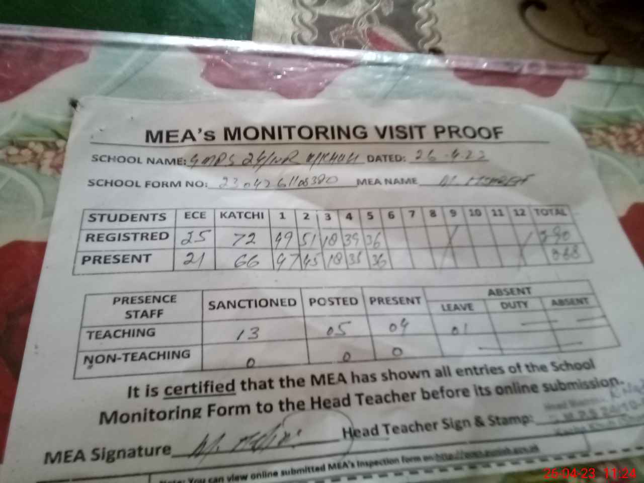 | Attendance Register | Head Teacher | MEA with School | Visit Proof |