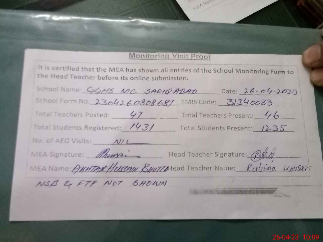 | EMIS Code: 31340033 | Name of School: GGHS MC SADIQ ABAD | |||