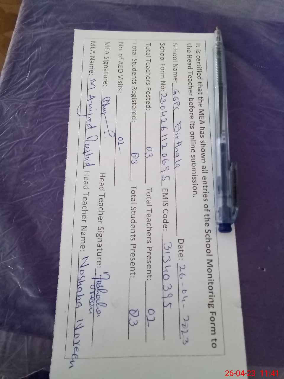| EMIS Code: 31340395 | Name of School: GGPS BIRTHWALA | |||