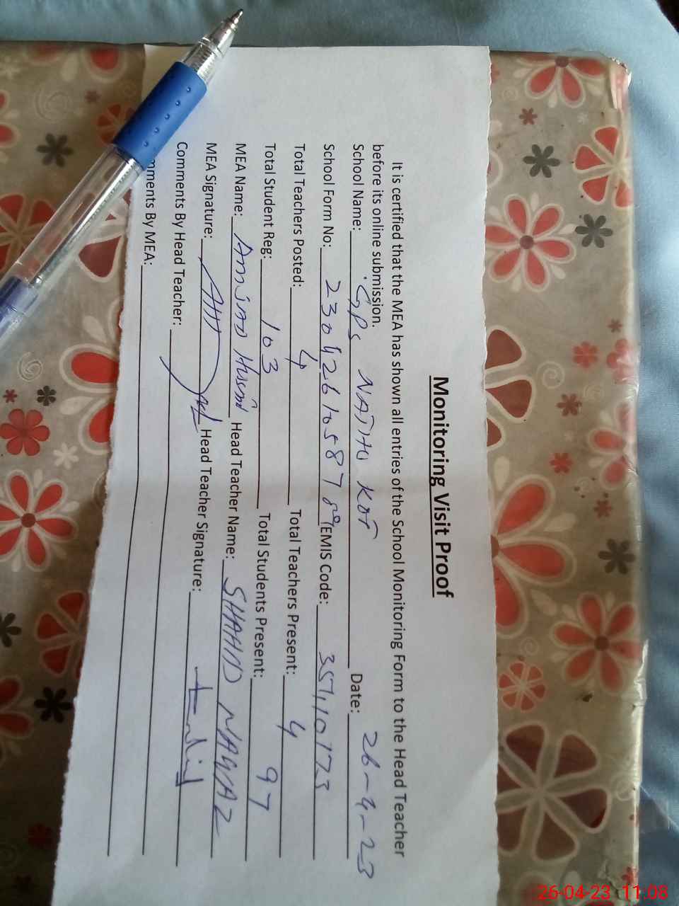 | Attendance Register | Head Teacher | MEA with School | Visit Proof |