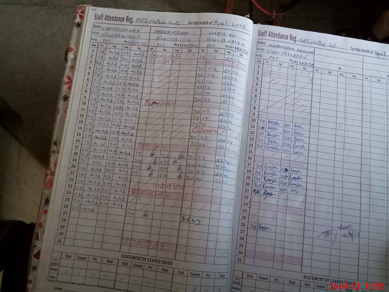 | CNIC | Full Name | Designation | R/C | Absence During Last Calender Month |
