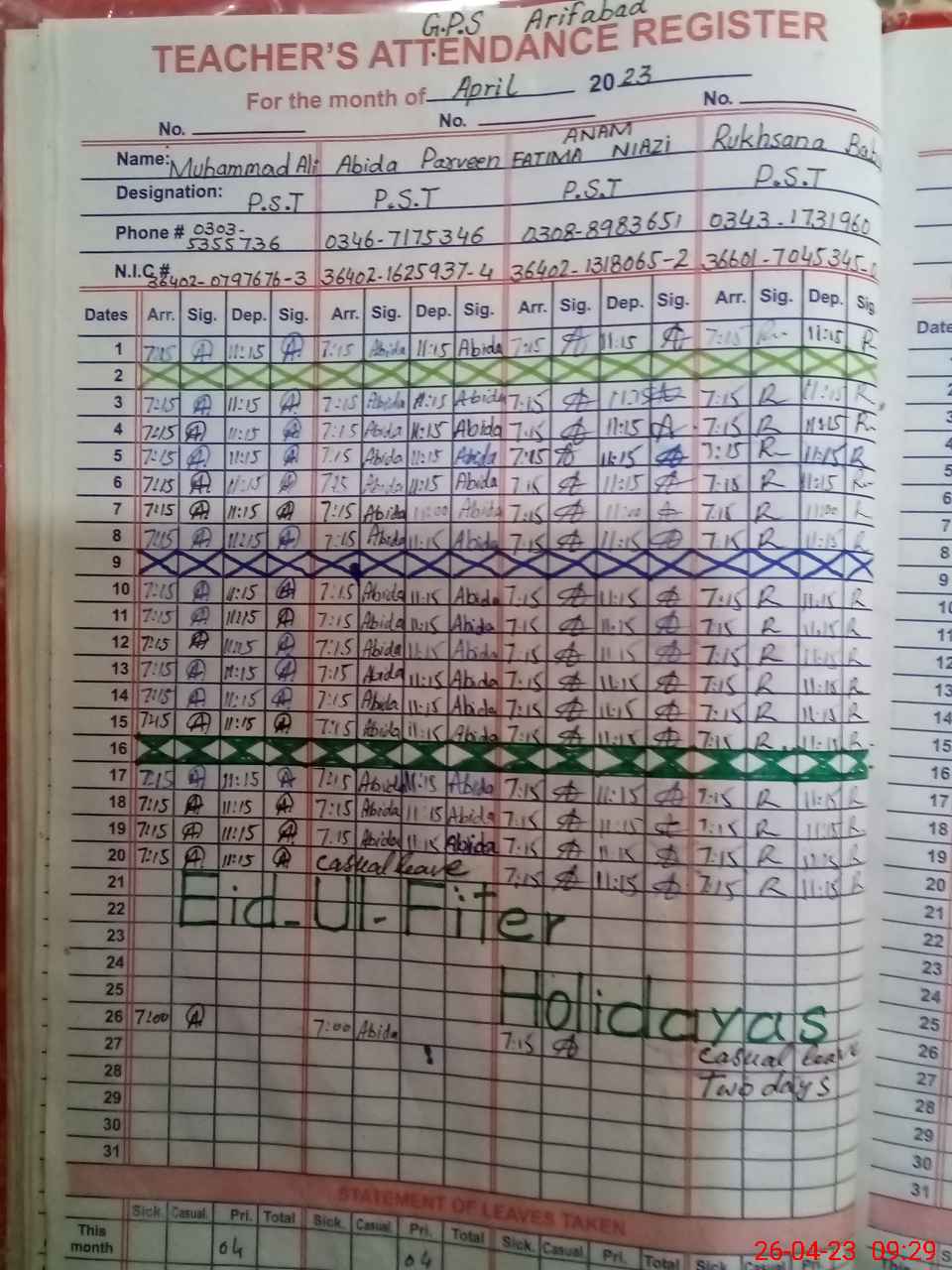 | Name: Ab**** Pa**** Designation: (School Headmaster's/Headmistress's) PST Phone/Cell Number: 03**** |