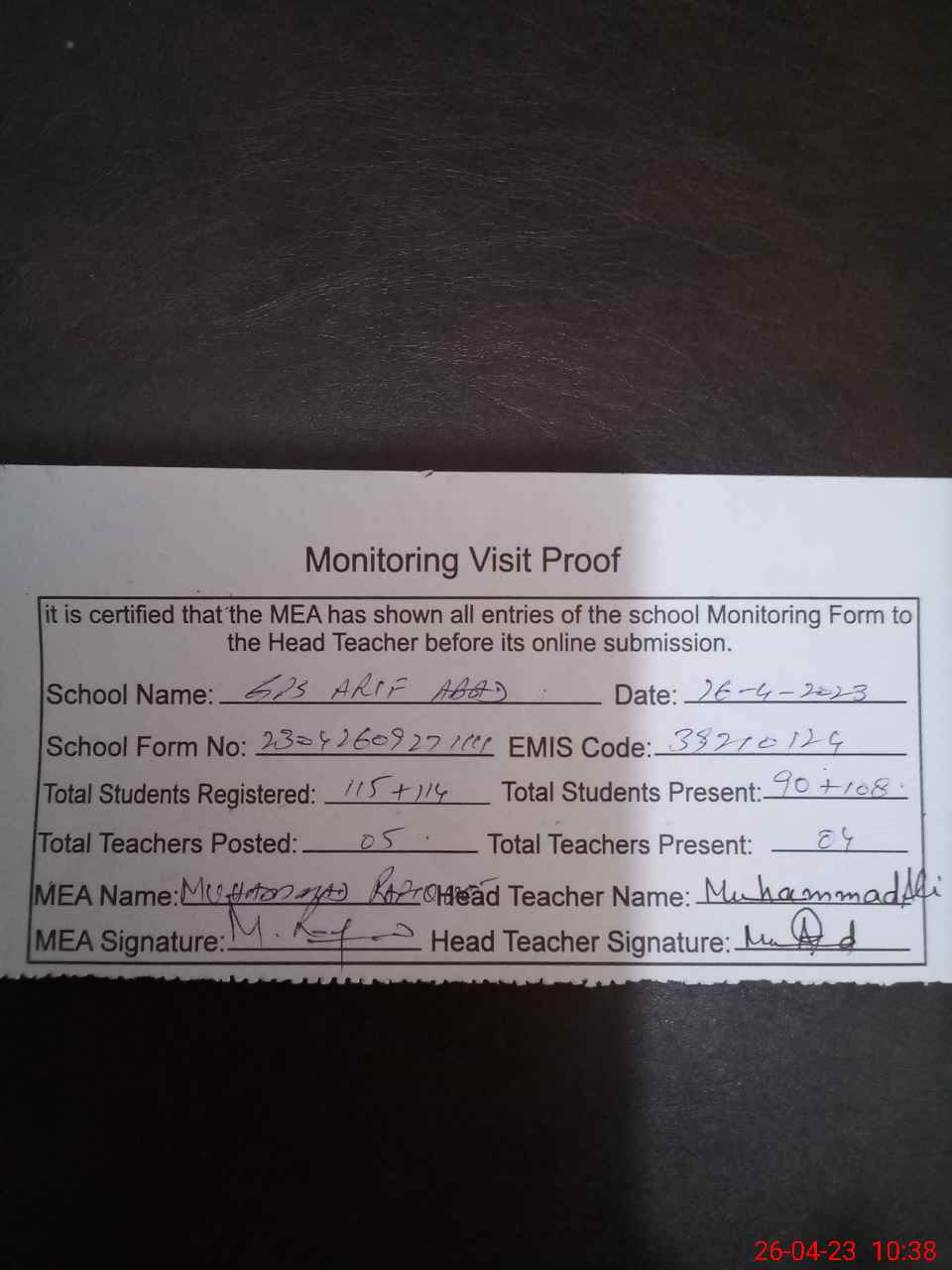 | Attendance Register | Head Teacher | MEA with School | Visit Proof |