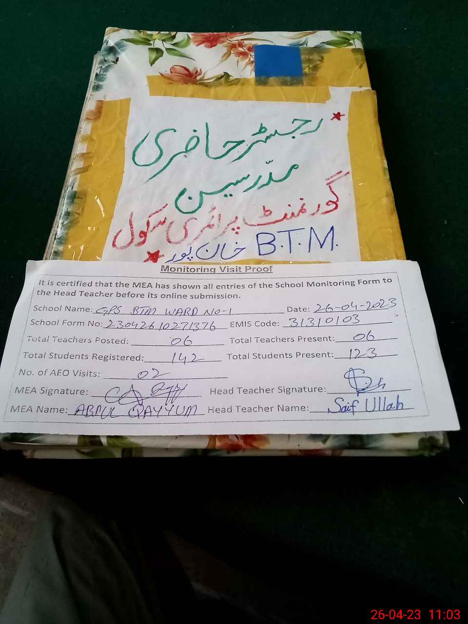 | EMIS Code: 31310103 | Name of School: GPS B.T.M WARD NO 1 KHAN PUR | |||
