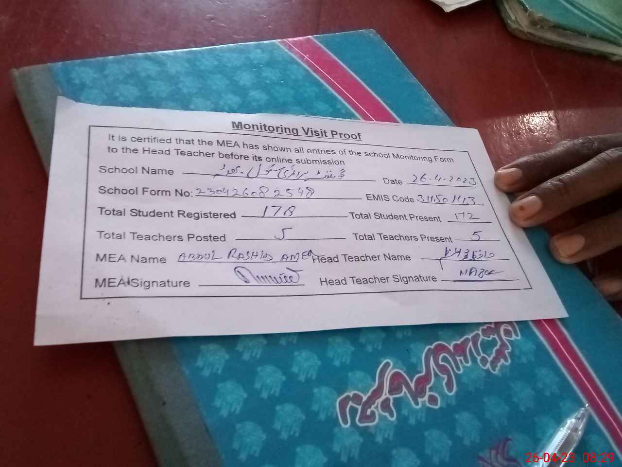 | Attendance Register | Head Teacher | MEA with School | Visit Proof |