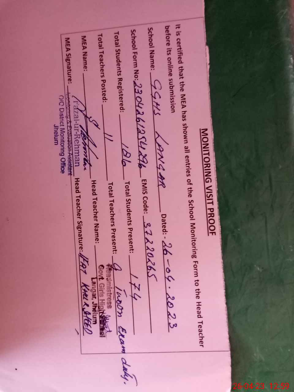 | Attendance Register | Head Teacher | MEA with School | Visit Proof |
