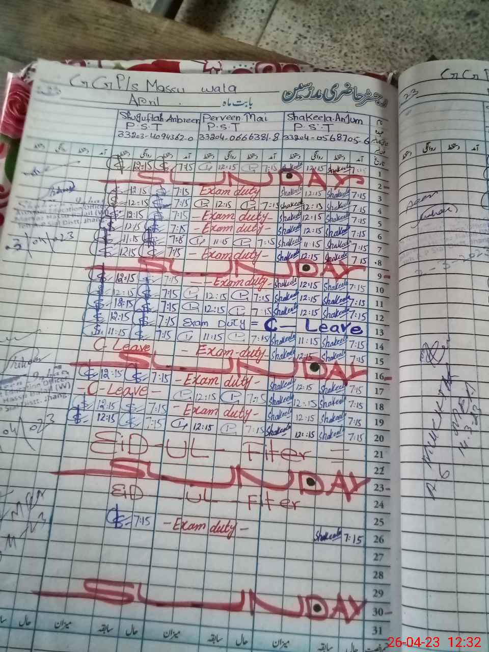 | 33**** | Pe**** Ma**** | PST | Regular | 0 | 0 | 0 | 0 | 0 | 0 | 0 | 0 | 0 | Exam Duty |