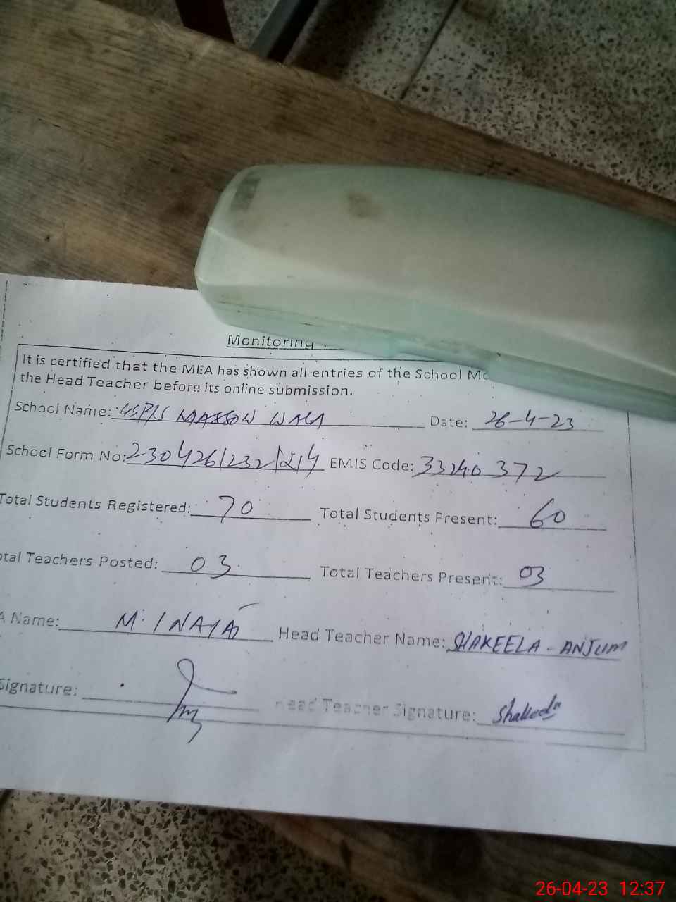 | Attendance Register | Head Teacher | MEA with School | Visit Proof |