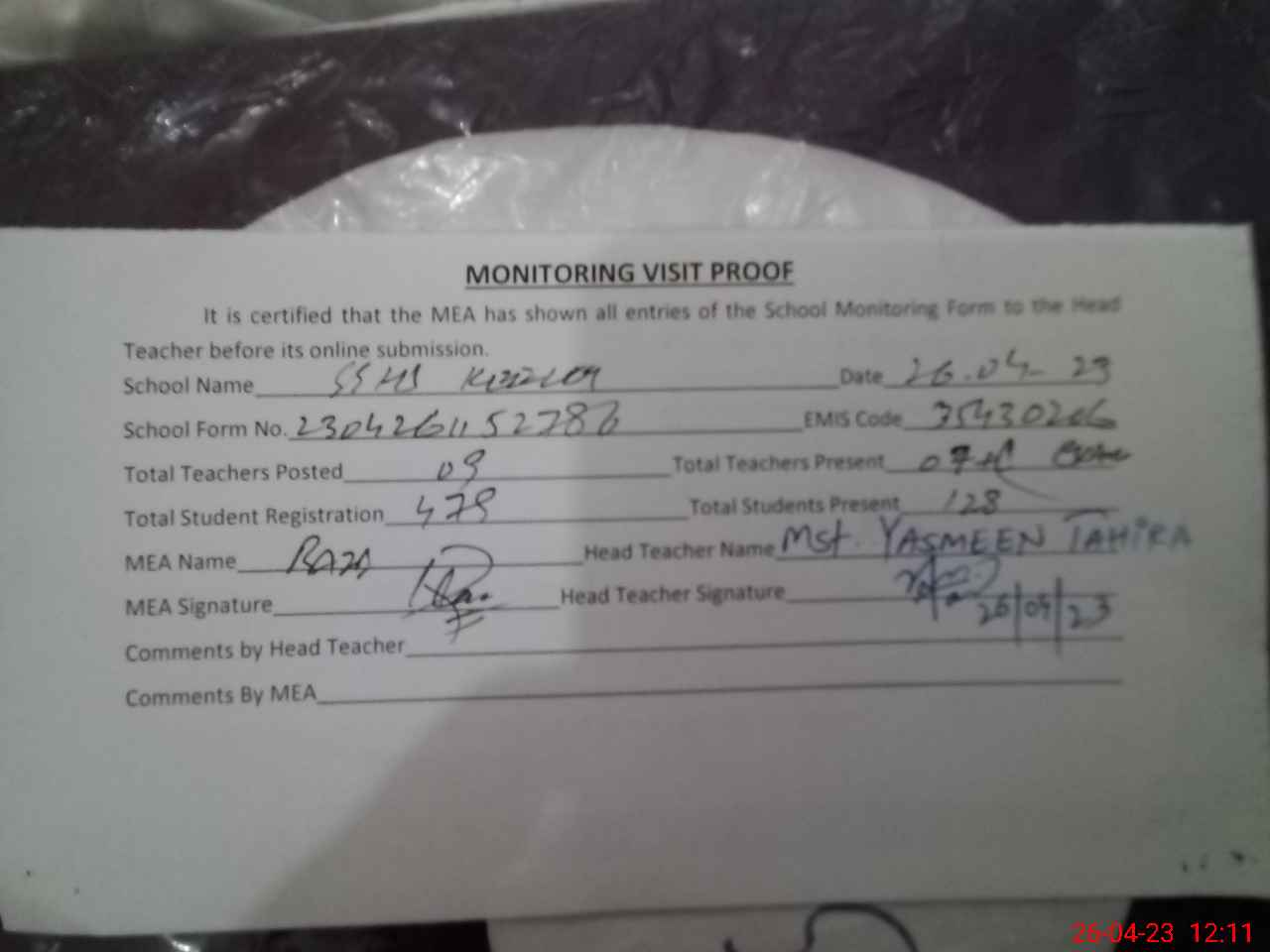 | Attendance Register | Head Teacher | MEA with School | Visit Proof |