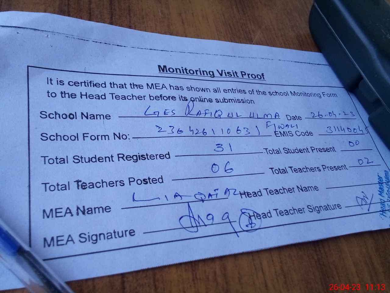 | Attendance Register | Head Teacher | MEA with School | Visit Proof |
